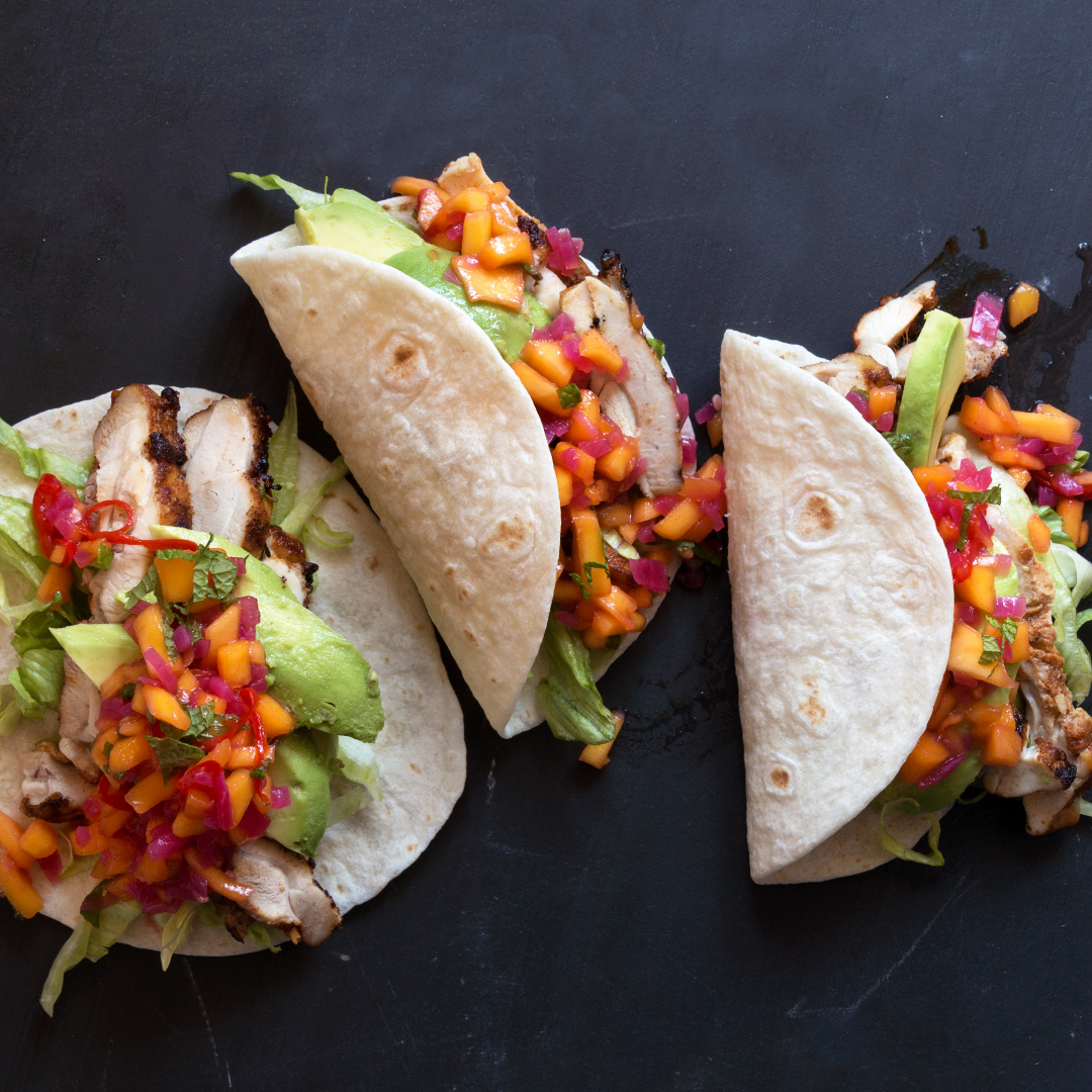 Chicken thighs are tossed with smoked paprika, cumin, chilli, oil and garlic and barbecued. These are sliced and served in soft taco tortillas with sliced iceberg lettuce, avocado and a salsa of cooked red onion, lime juice, sugar, chilli, diced mango and mint.