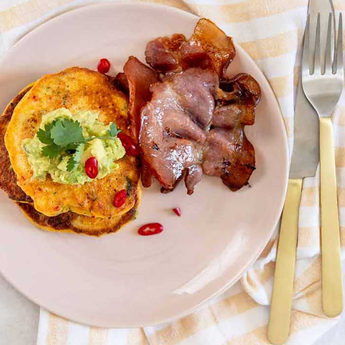 These savoury pancakes make a delicious change for breakfast - or even a light dinner. If you don’t have pumpkin, leftover potato or sweet potato would also work well.